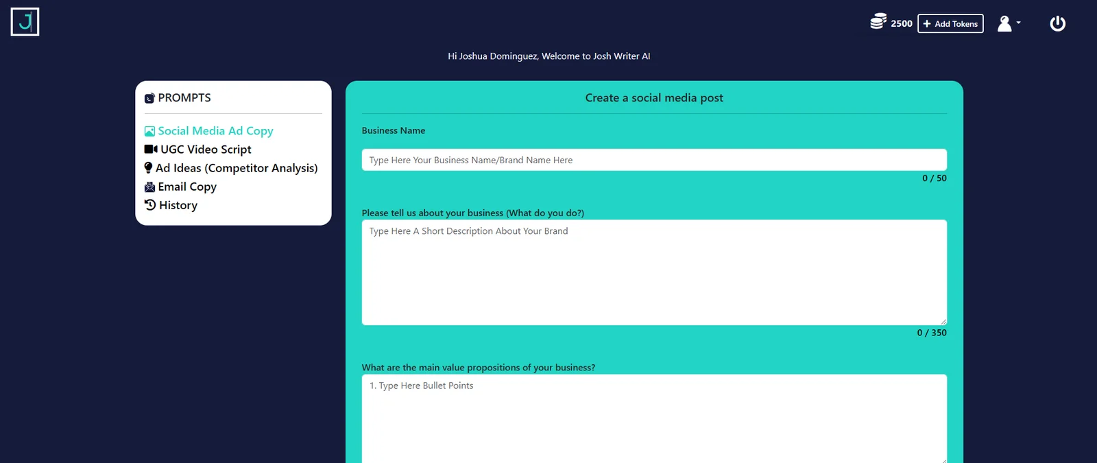Unlock the full potential of your advertising with Josh Writer AI, your essential toolkit for creating ads that not only catch the eye but compel action. Transform mundane into magnetic—bid farewell to uninspiring content and embrace copy that captivates, converts, and consistently outperforms.